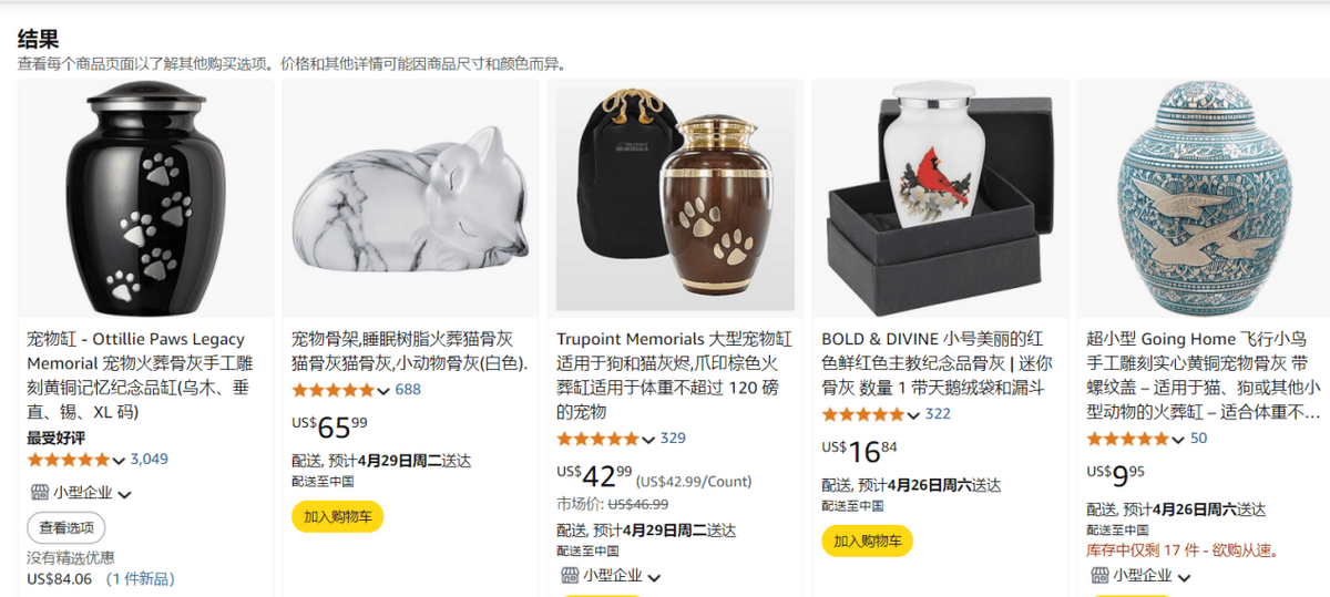 正在亚马逊上搜刮宠物骨灰盒、宠物墓碑等产物,也有不少产物正在出售, 好比一个售价80美元的宠物骨灰盒,已有3000多人采办。