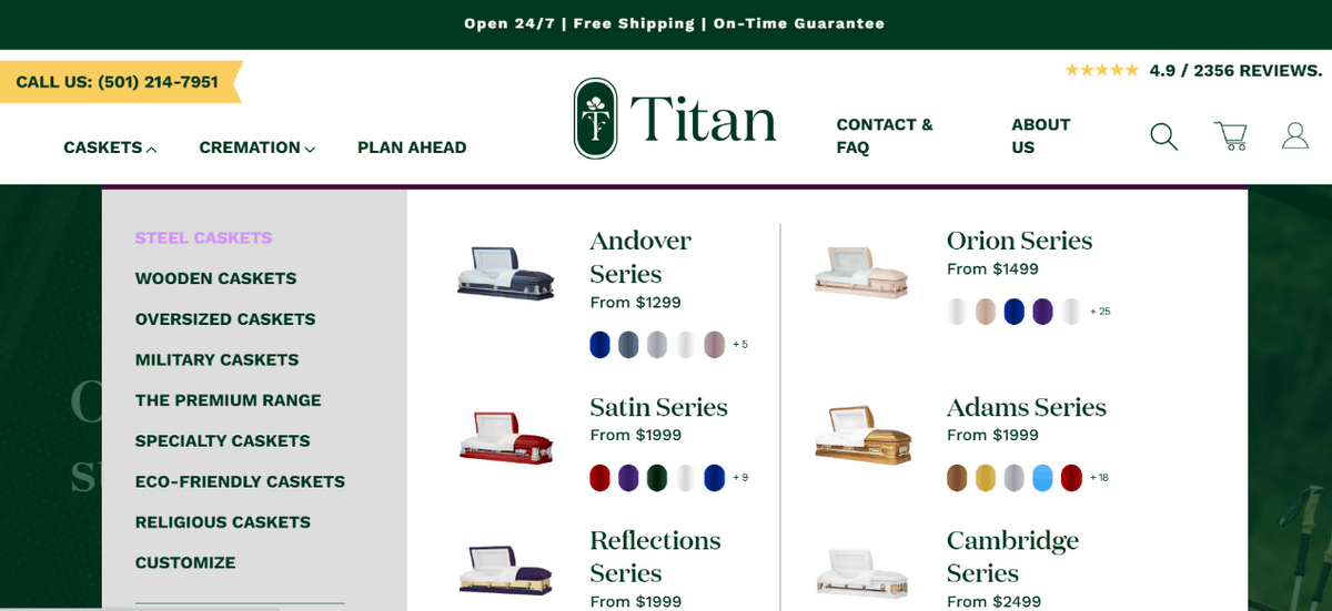 Titan Casket供给跨越1000种可定制选项,包罗颜色、板材、配件等,客户选择完毕当前,会进一步跟客户确认交付时间,并供给免费运输办事。